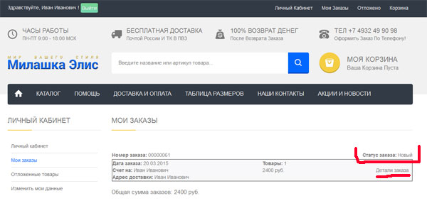1. Чтобы узнать статус заказа необходимо попасть в Личный кабинет покупателя. А для этого надо Авторизоваться на сайте.